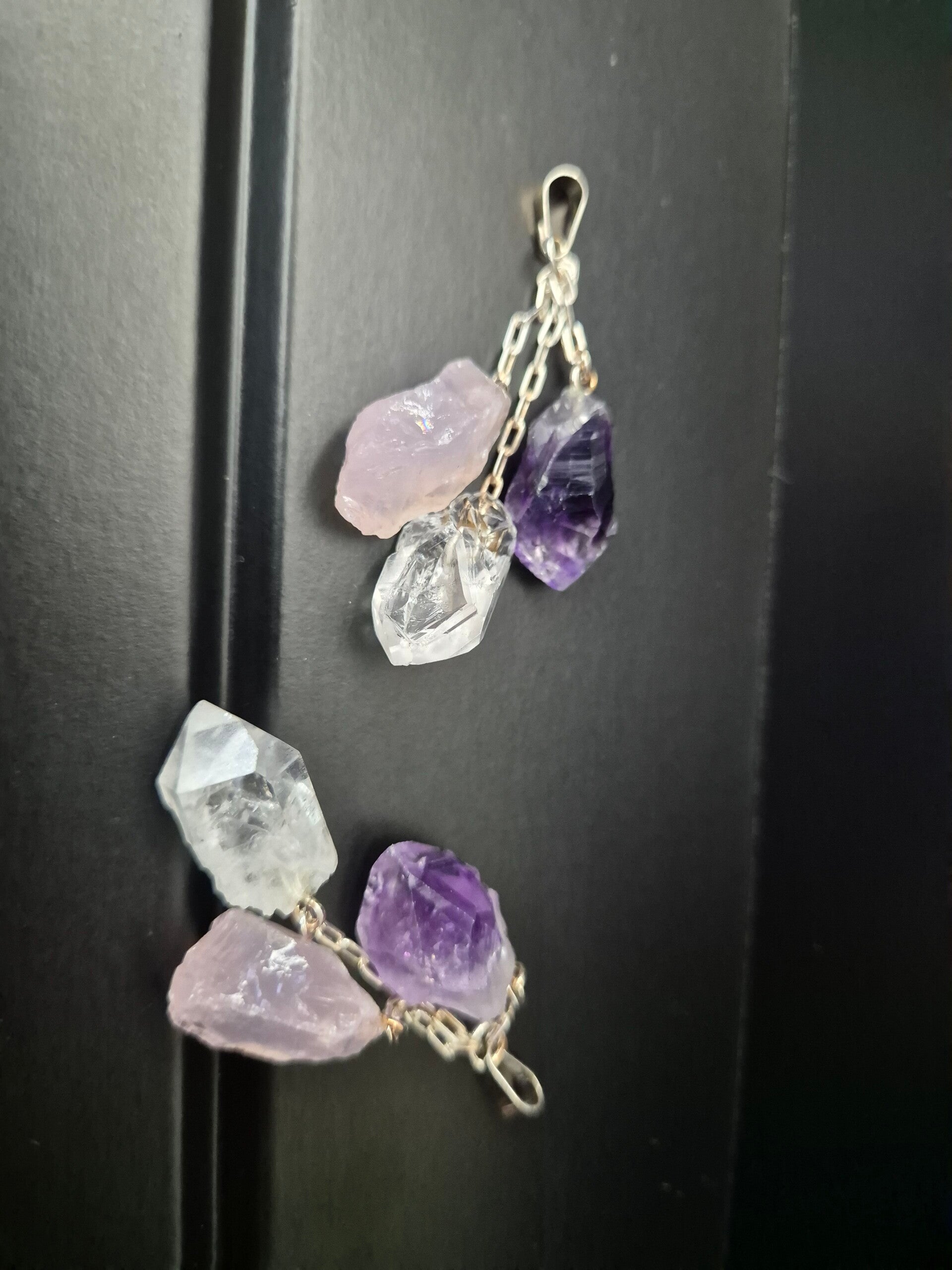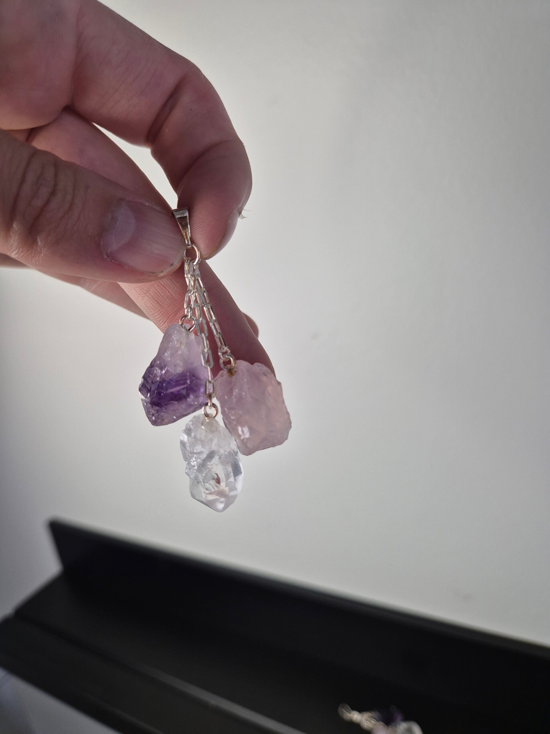Bergkristal verbindt de andere kristallen, in dit geval amethist en rozenkwarts, en versterkt hun werking. Door deze kristallen samen te gebruiken zal hun gezamenlijke kracht sterker zijn dan wanneer deze kristallen afzonderlijk gebruikt worden.