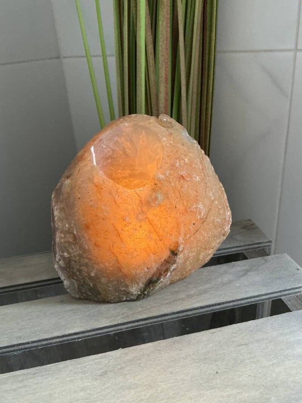 Agaat staat symbool voor balans, bescherming en innerlijke rust. Het zachte licht van een waxinelichtje wordt prachtig weerkaatst in de kristallen structuur, wat zorgt voor een warme, serene sfeer in elke kamer. Perfect voor yoga-ruimtes, meditatiehoeken, of als stijlvol accent op je salontafel.