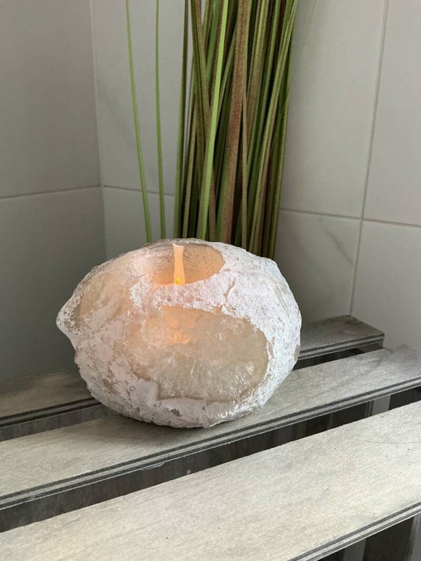 Agaat staat symbool voor balans, bescherming en innerlijke rust. Het zachte licht van een waxinelichtje wordt prachtig weerkaatst in de kristallen structuur, wat zorgt voor een warme, serene sfeer in elke kamer. Perfect voor yoga-ruimtes, meditatiehoeken, of als stijlvol accent op je salontafel.