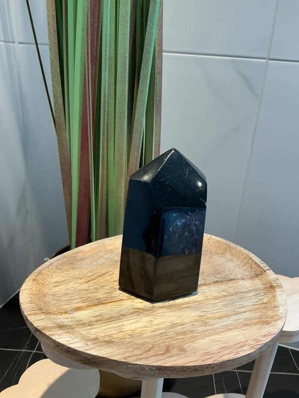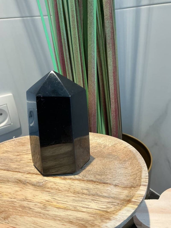 Deze prachtige zwarte obsidiaan toren is een krachtige spirituele steen, gepolijst tot een elegante puntvorm. Obsidiaan is een vulkanisch glas dat ontstaat uit snel afgekoelde lava, en staat bekend om zijn sterke beschermende en zuiverende eigenschappen. De torenvorm helpt om energie te bundelen en omhoog te leiden, wat deze steen ideaal maakt voor meditatie, healing of als stijlvolle toevoeging aan je interieur.