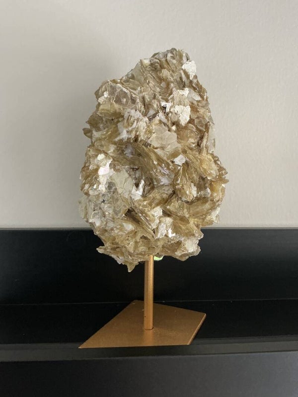 Deze prachtige Gouden Mica op een stijlvolle standaard is niet alleen een schitterend decoratiestuk, maar draagt ook een krachtige spirituele energie met zich mee.