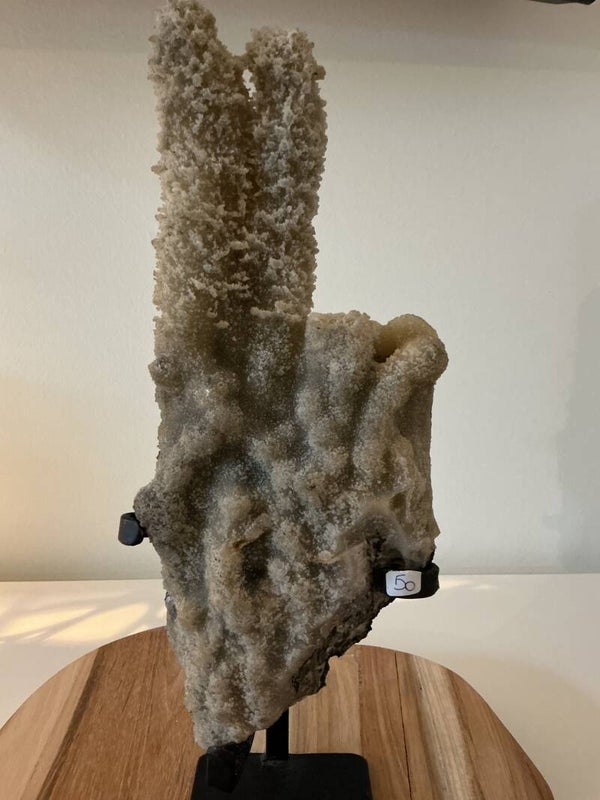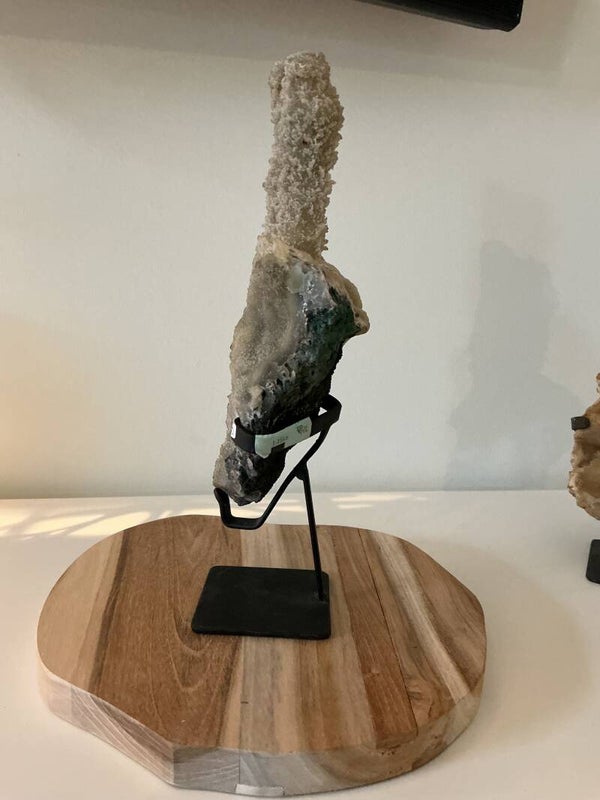 Deze prachtige Chalcedoon op standaard is een echte eyecatcher. Met zijn unieke natuurlijke vorm straalt hij rust en harmonie uit. Het stuk weegt 1,150 kilo, is 28 cm hoog en ongeveer 10 cm breed. Door de metalen standaard komt de steen mooi tot zijn recht en wordt hij een bijzondere decoratie in elke ruimte.
