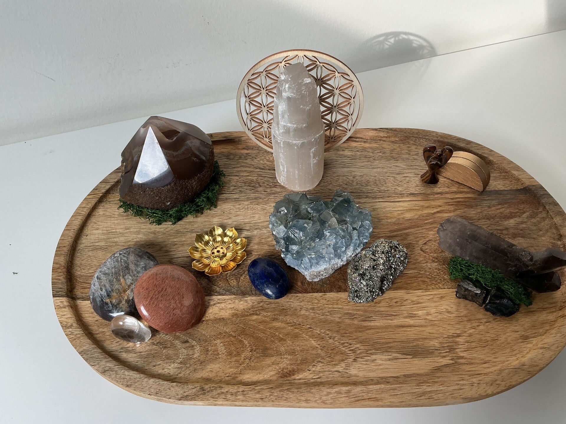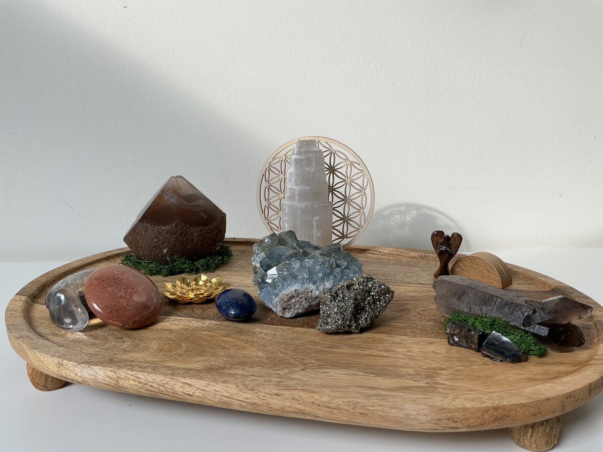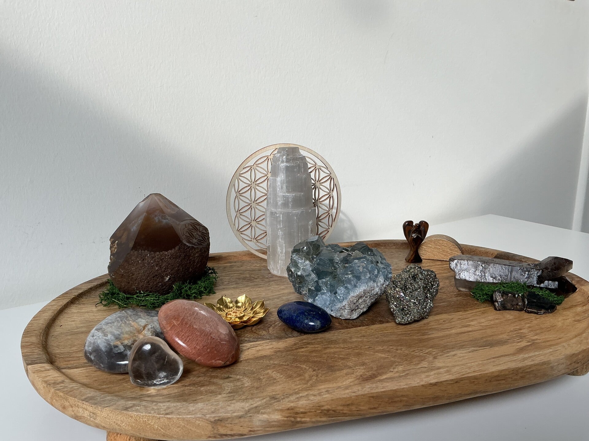 Op de achtergrond draagt de levensbloem de universele harmonie, terwijl aventurijn zachte groei en hartenergie brengt.