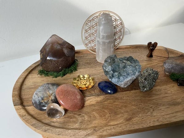 De lijn naar boven opent zich via lapis lazuli, seleniet en celestien — een pad van intuïtie, waarheid en verbinding met het hogere.